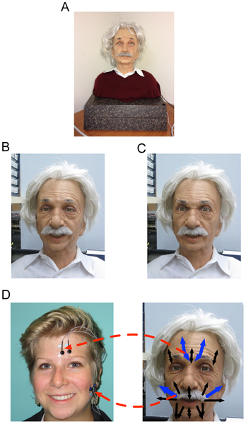 (A) Einstein the robot, as the participants saw him. Robot expressions of (B) happy and (C) angry. (D) Relationships were investigated between the actuators shown in blue, and facial muscle activity in the corrugator and zygomaticus, as indicated by the red arrows. The subject in the photograph has given written informed consent, as outlined in the PLOS consent form, to publication of their photograph.