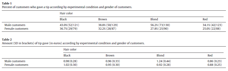 Experiment 1Overall, blond hair was associated with an increase in male tipping behaviour. Men were more likely to give tips to the waitresses with blond hair and also gave larger amounts of money when they did. In fact, men gave blond haired waitresses tips that were 25% higher when compared to the other three colours combined.