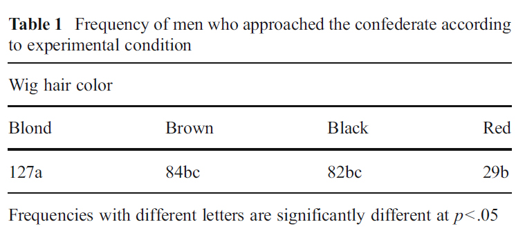 Experiment 2Results showed that the number of approaches by hair colour was 127 for blondes, brown 84, black 82, red 29.