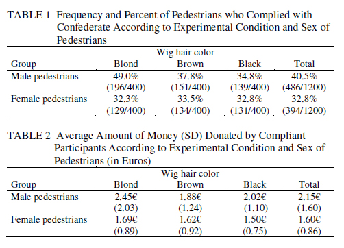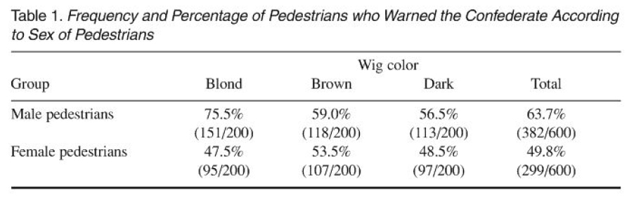 In the third ‘man-on-the-street’ experiment, women where once again outfitted with various coloured wigs. This time they were stationed to collect donations for a French Telethon. In total 1200 men and 1200 women between the ages of 25 and 60 were solicited in various locations during the study. As before, the confederates were instructed not to wear makeup and wear the same outfit under each condition.